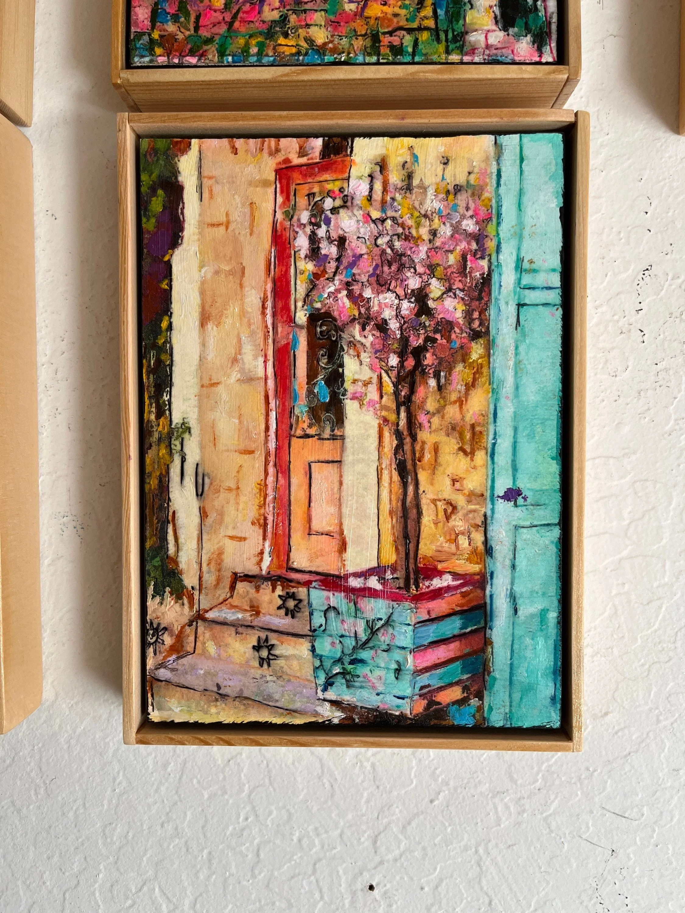 Small artwork, original oil painting of picturesque Portuguese building façades typical of the historic streets of Lisbon.