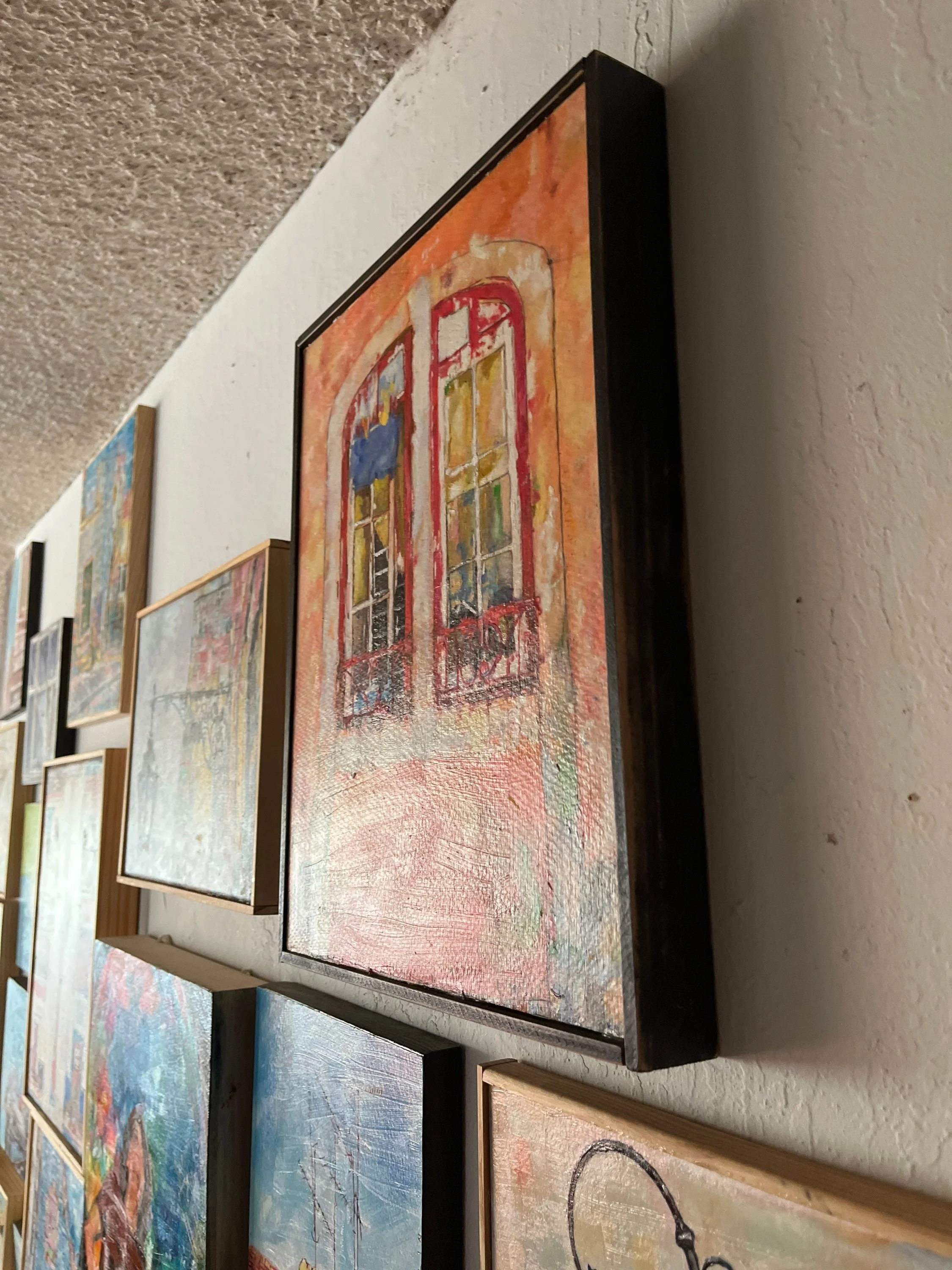 Original Oil painting framed 11x14 windows façade cityscape Lisbon street buildings Portuguese old town framed
